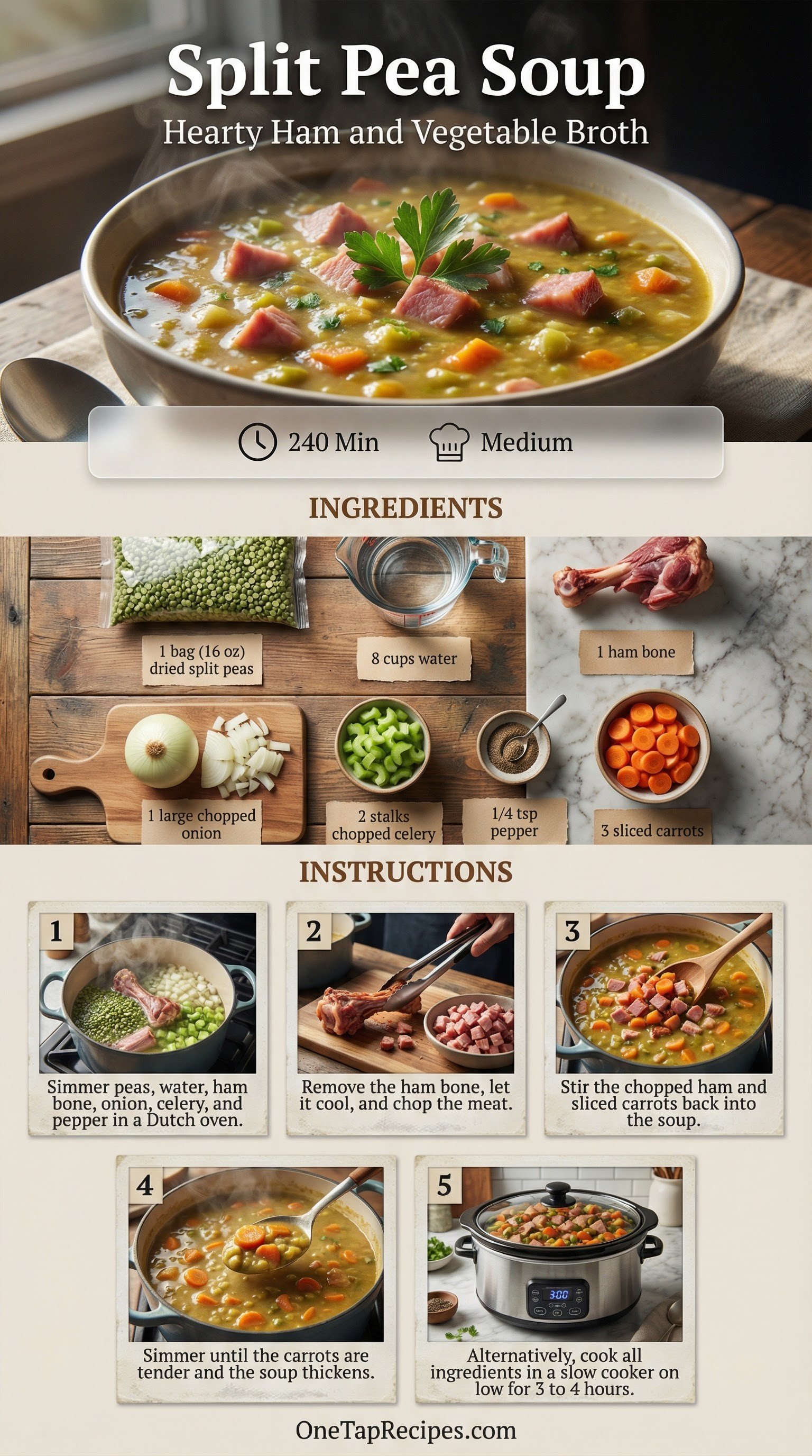 A hearty, comforting split pea soup built on a rich ham bone broth. The slow simmer extracts deep, smoky flavor from the pork while breaking down the peas into a thick, creamy texture. It is a perfect warming meal for chilly days, packed with tender carrots, celery, and savory chunks of ham.