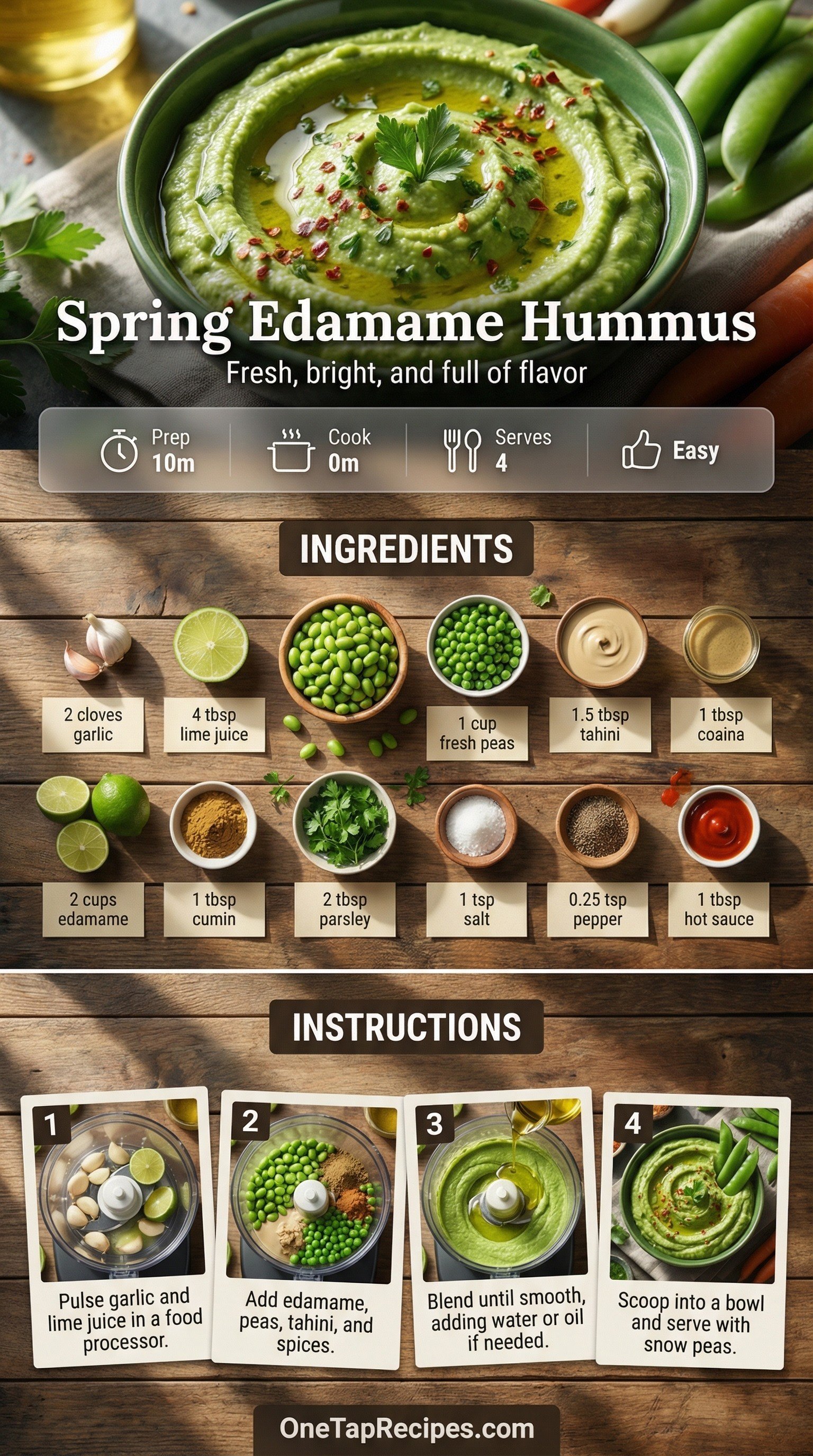 Spring edamame hummus is a bright, green twist on the classic dip. Blending tender edamame and sweet fresh peas creates a uniquely fresh and colorful base. Fresh lime juice and sesame tahini add a creamy, zesty finish that balances the earthy legumes. A touch of cumin and hot sauce brings just the right amount of warmth to every bite. It makes an excellent afternoon snack with crisp vegetables or a flavorful spread for a hearty sandwich.