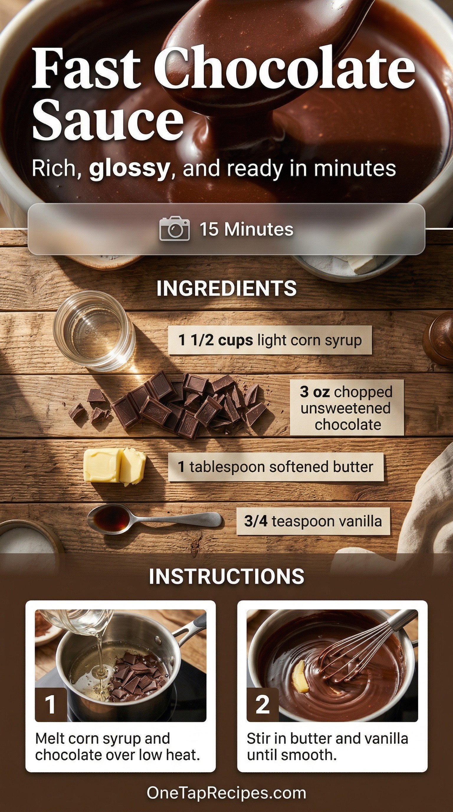 Thick, glossy, and intensely rich, this four-ingredient chocolate sauce transforms ordinary desserts into something special. Melting unsweetened baking chocolate into corn syrup creates a beautifully smooth texture that won't seize up when it hits cold ice cream. A touch of butter and vanilla rounds out the deep cocoa flavor. You'll want to drizzle it warm over pound cake, fresh fruit, or your favorite sundae.