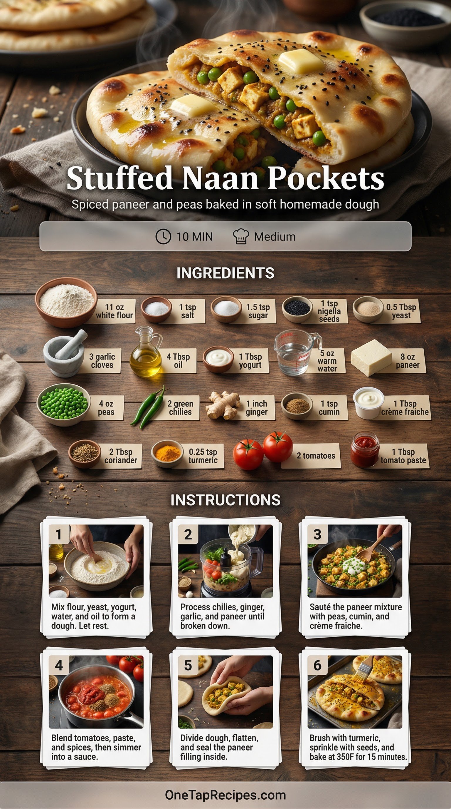 Soft, homemade naan dough wraps around a savory filling of spiced paneer and sweet peas to create these satisfying baked pockets. The from-scratch dough gets a boost of flavor from garlic and nigella seeds, baking up golden and tender. A rich, simmered tomato sauce accompanies the pockets for dipping. These make an excellent appetizer for gatherings or a comforting weekend snack.