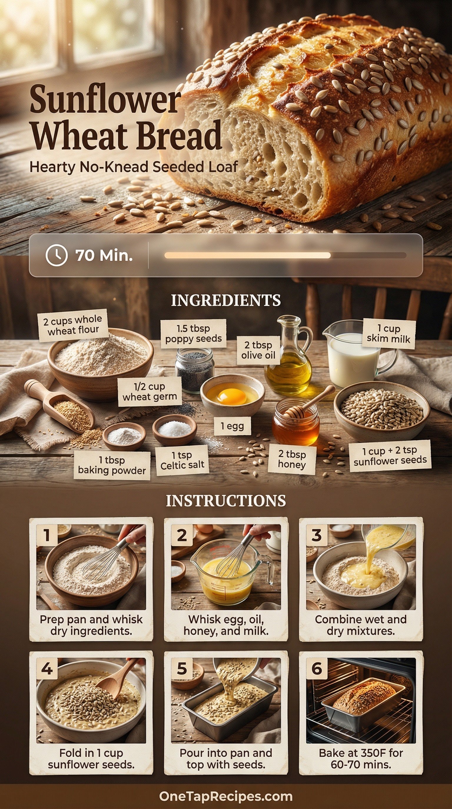 This hearty loaf is packed with whole wheat flour, wheat germ, and crunchy sunflower seeds. It requires no yeast or kneading, relying on baking powder for a simple and fast preparation. Honey adds a touch of sweetness that balances the nutty, earthy flavors of the seeds and grains. Serve thick slices for a wholesome breakfast or use it as a sturdy base for your favorite sandwich.