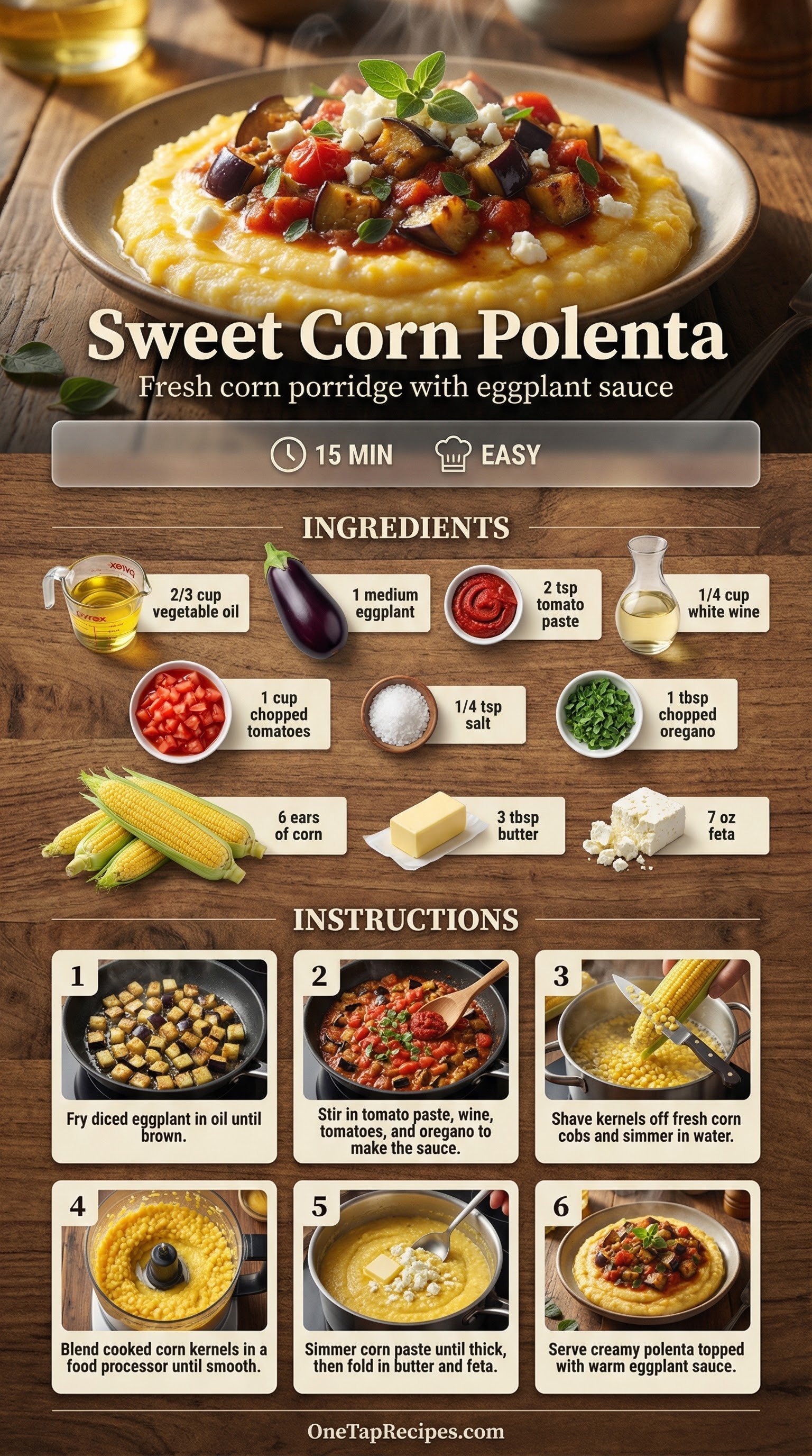 11. 11Spoon the creamy fresh corn polenta into shallow serving bowls. Top the center of each portion with the warm eggplant and tomato sauce.