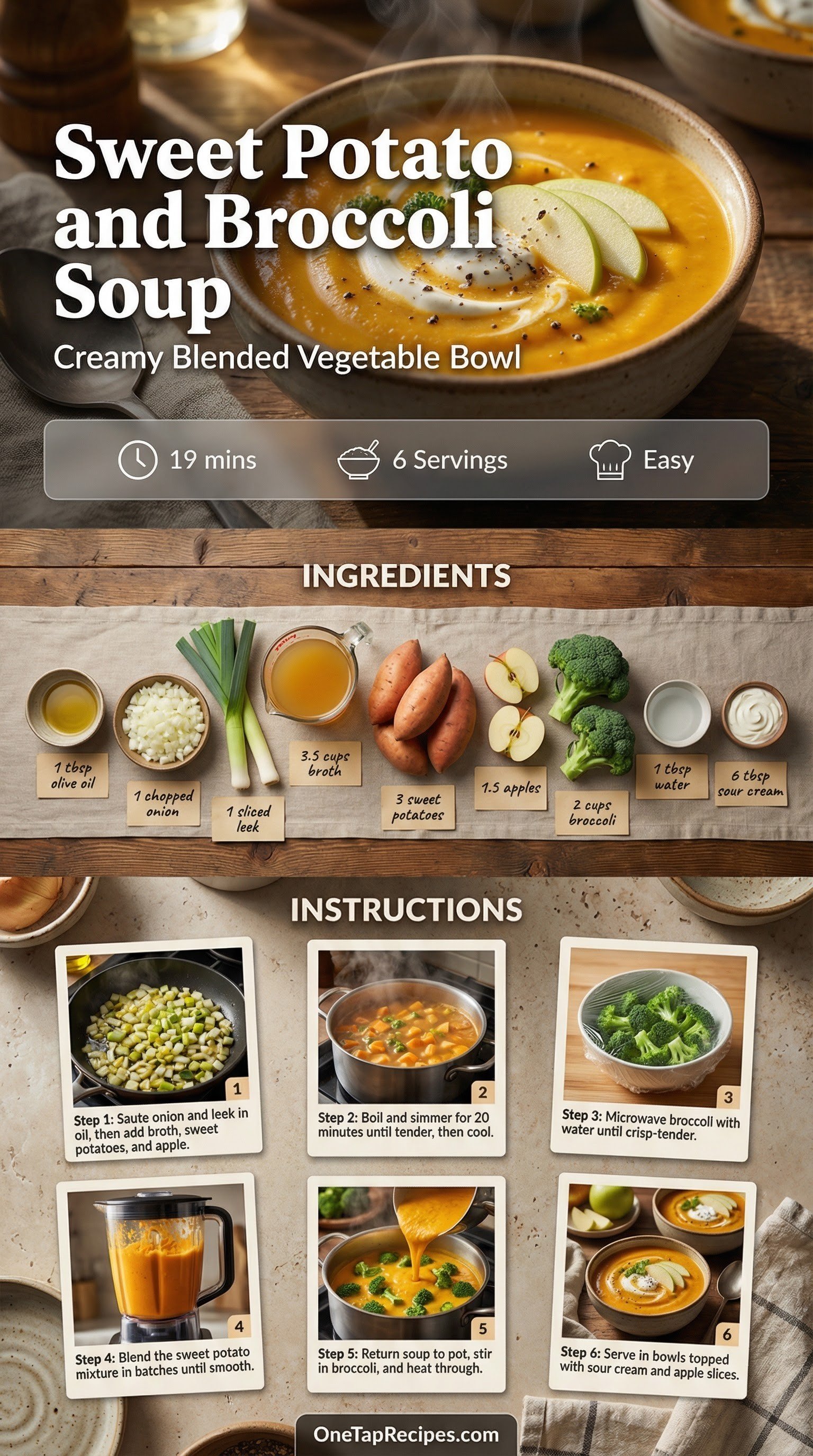 Sweet Potato and Broccoli Soup is a comforting, blended vegetable bowl that pairs earthy root vegetables with bright fruit notes. The base builds flavor with sautéed leeks and onions before simmering sweet potatoes and chopped apples in savory broth. Once blended until smooth, crisp-tender broccoli florets are stirred in to provide a satisfying textural contrast. A dollop of sour cream and fresh apple slices finish each bowl with a touch of richness and crunch. It makes a warming lunch or a light weeknight dinner during the cooler months.