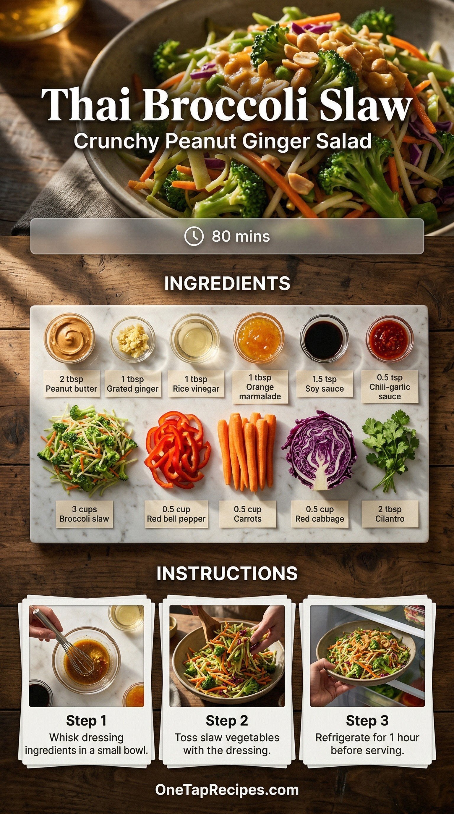 This crunchy Thai broccoli slaw brings bright flavor and serious texture to your table. The base combines crisp broccoli slaw, sweet red bell peppers, julienned carrots, and shredded red cabbage for a colorful mix. It gets tossed in a quick homemade dressing made from creamy peanut butter, fresh ginger, rice vinegar, and a touch of orange marmalade for sweetness. A hint of chili-garlic sauce adds just the right amount of heat. Serve this refreshing side dish at your next barbecue or pair it with grilled chicken for an easy weeknight dinner.