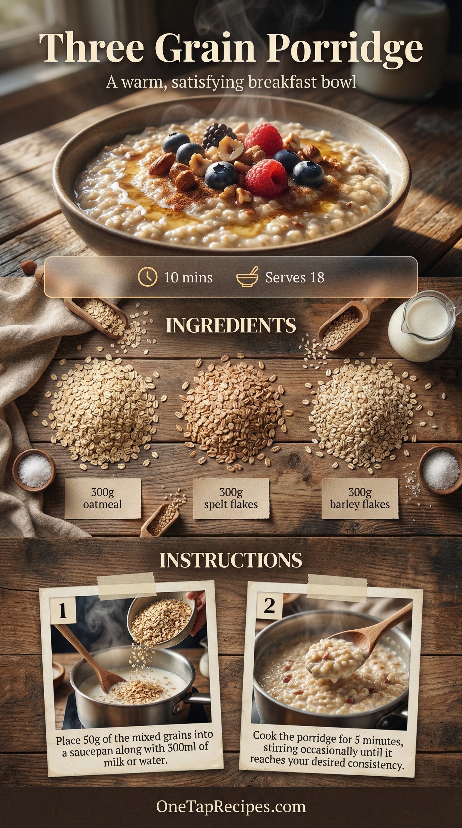 A simple dry mix of oatmeal, spelt, and barley flakes creates a warm, satisfying breakfast bowl. Preparing this grain blend in advance saves time on busy mornings. The combination of three distinct grains offers a chewy, substantial texture compared to standard oats. You can store the raw mixture in the pantry for months and cook individual portions as needed. Serve the finished porridge with fresh fruit and a touch of sweetness.
