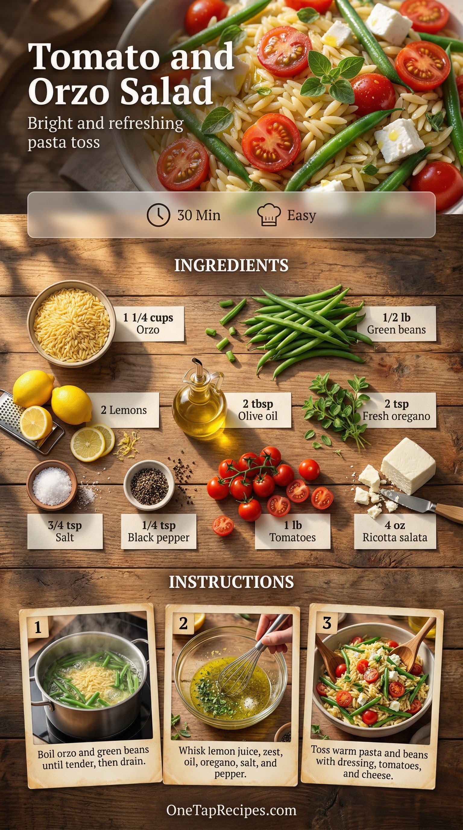 Tomato and orzo salad is a bright, refreshing pasta dish that comes together with minimal effort. Tender orzo and crisp green beans form a satisfying base, while juicy ripe tomatoes add a burst of sweetness. A simple dressing of fresh lemon juice, olive oil, and chopped oregano ties the ingredients together with a zesty, herbaceous finish. Crumbled ricotta salata brings a pleasant salty bite to every forkful. Serve this colorful salad warm or at room temperature for a light lunch or an easy weeknight side dish.