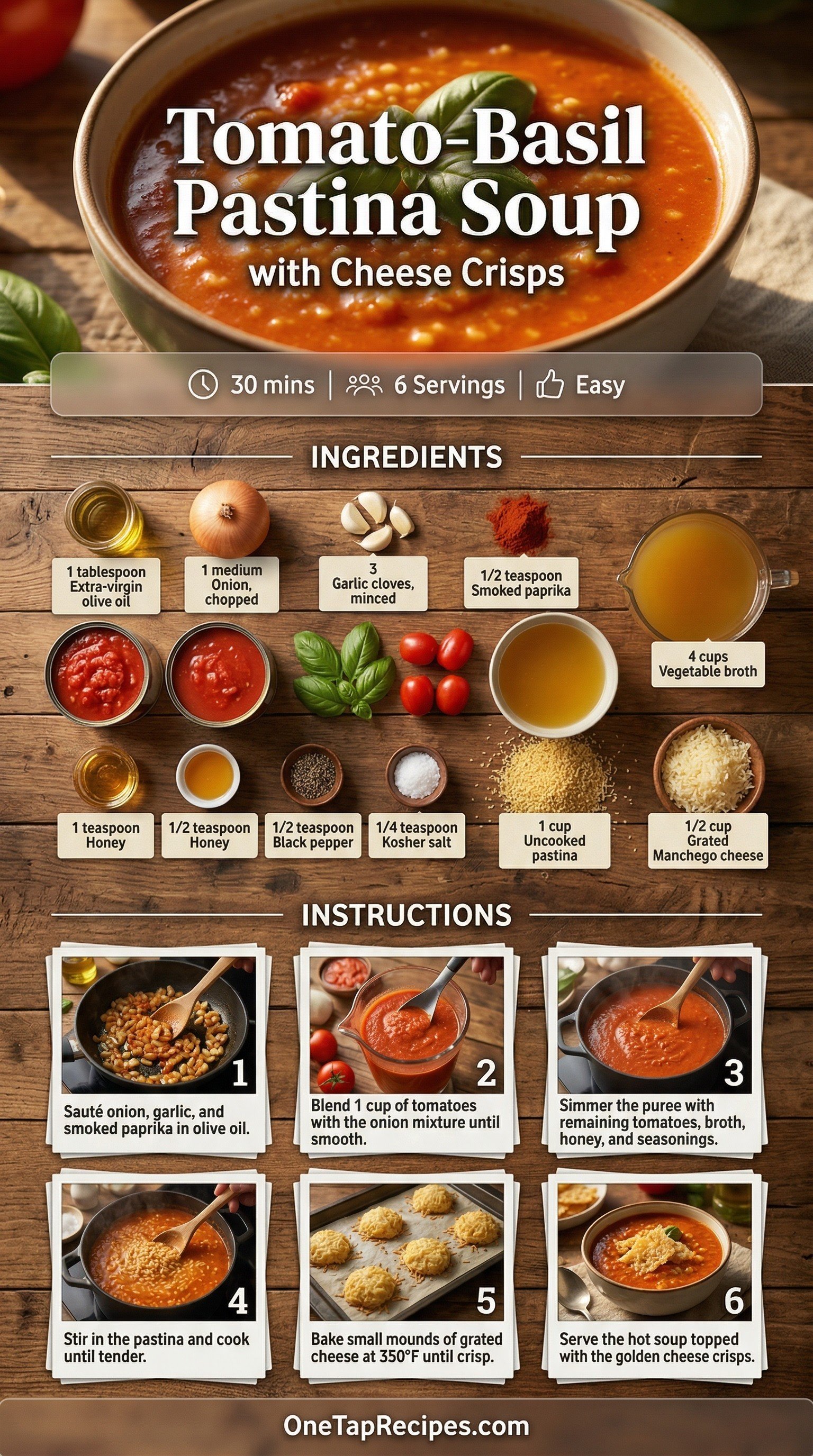 Tomato-Basil Pastina Soup with Cheese Crisps