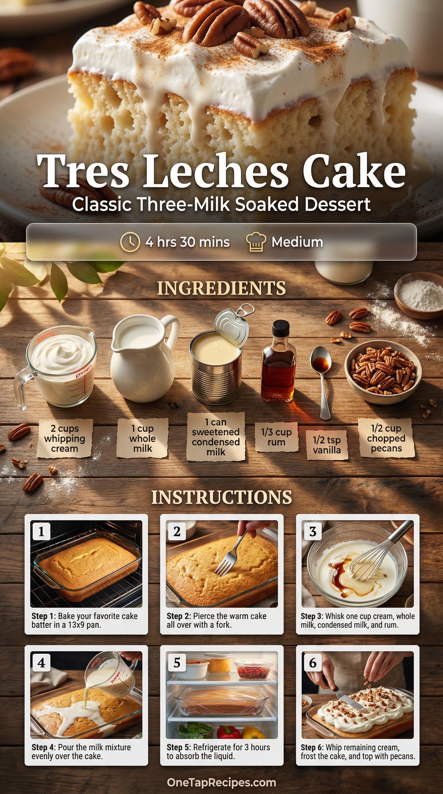 This classic Latin American dessert features a tender sponge soaked in a rich blend of three milks. By starting with your favorite yellow or white cake batter, you can easily create a decadent, melt-in-your-mouth treat infused with a hint of rum. A fluffy whipped cream topping and toasted pecans add a satisfying crunch to the sweet, creamy base. It is an excellent make-ahead dessert for parties and family gatherings.