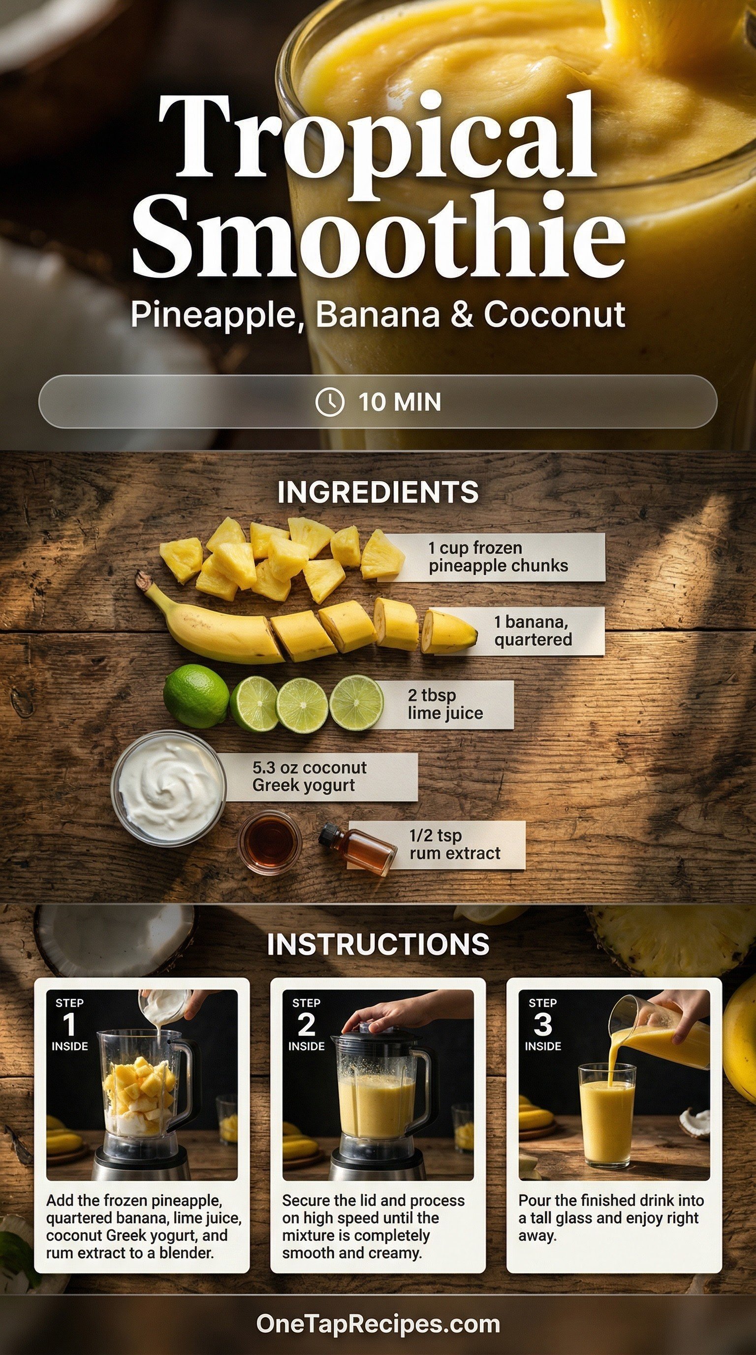 1. 1Add the frozen pineapple, quartered banana, lime juice, coconut Greek yogurt, and rum extract to a blender.