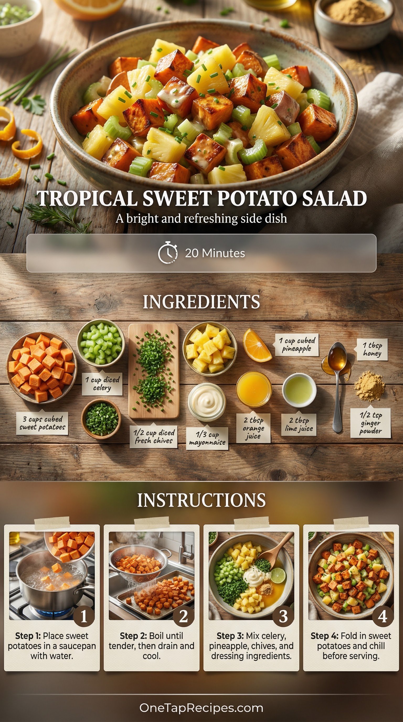 Swap out your standard side dish for a bright and refreshing take on potato salad. Tender cubes of sweet potato provide a naturally sweet base that pairs perfectly with juicy pineapple chunks and crisp celery. A creamy dressing made with mayonnaise, fresh citrus juices, honey, and a hint of ginger ties everything together. Serve this chilled salad at your next summer barbecue or pack it for a quick weekday lunch.