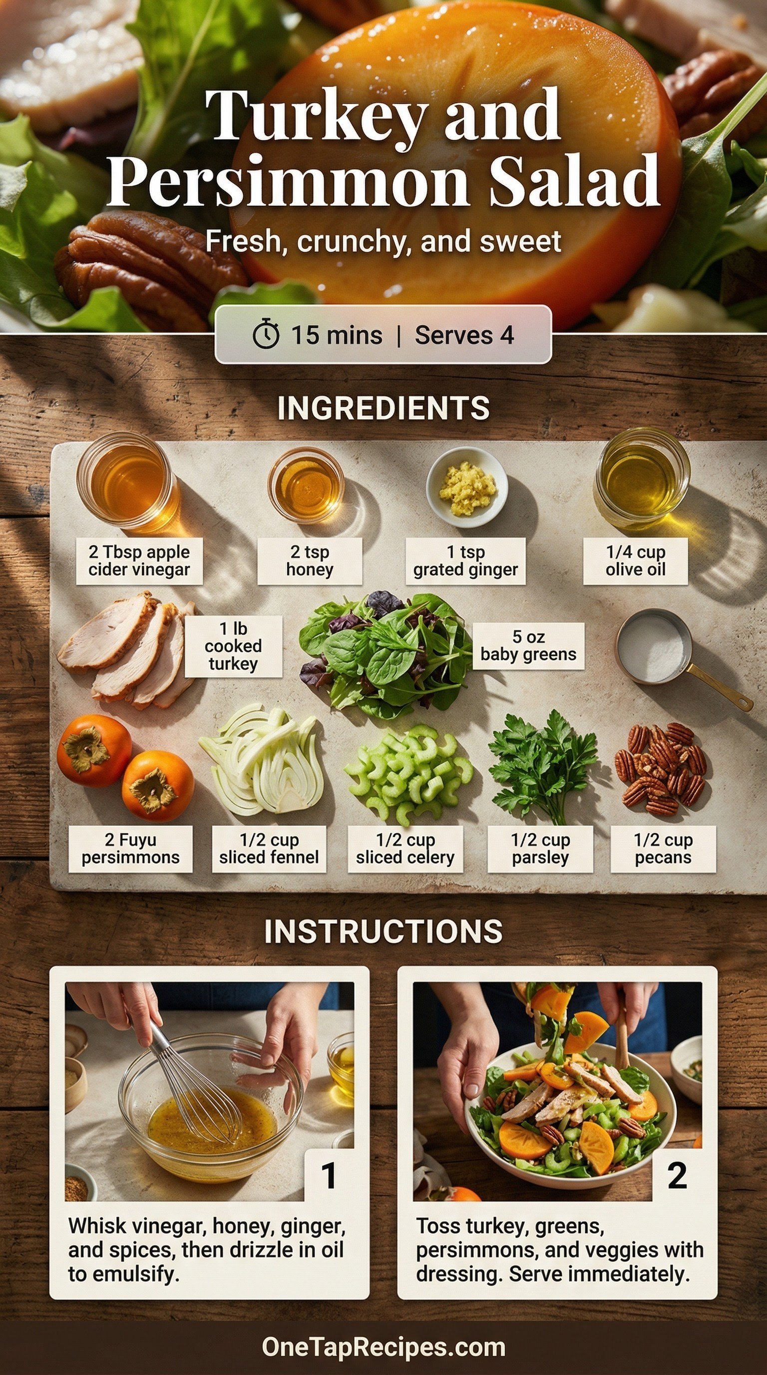 Sweet slices of fresh Fuyu persimmon meet savory leftover turkey in this bright, crunchy bowl. You'll love how the peppery baby greens and crisp fennel balance the rich, toasted pecans. A quick homemade dressing of apple cider vinegar, honey, and fresh ginger ties everything together with a zesty kick. It's a fantastic way to repurpose roasted poultry into a light, satisfying lunch or dinner that doesn't feel like an afterthought.