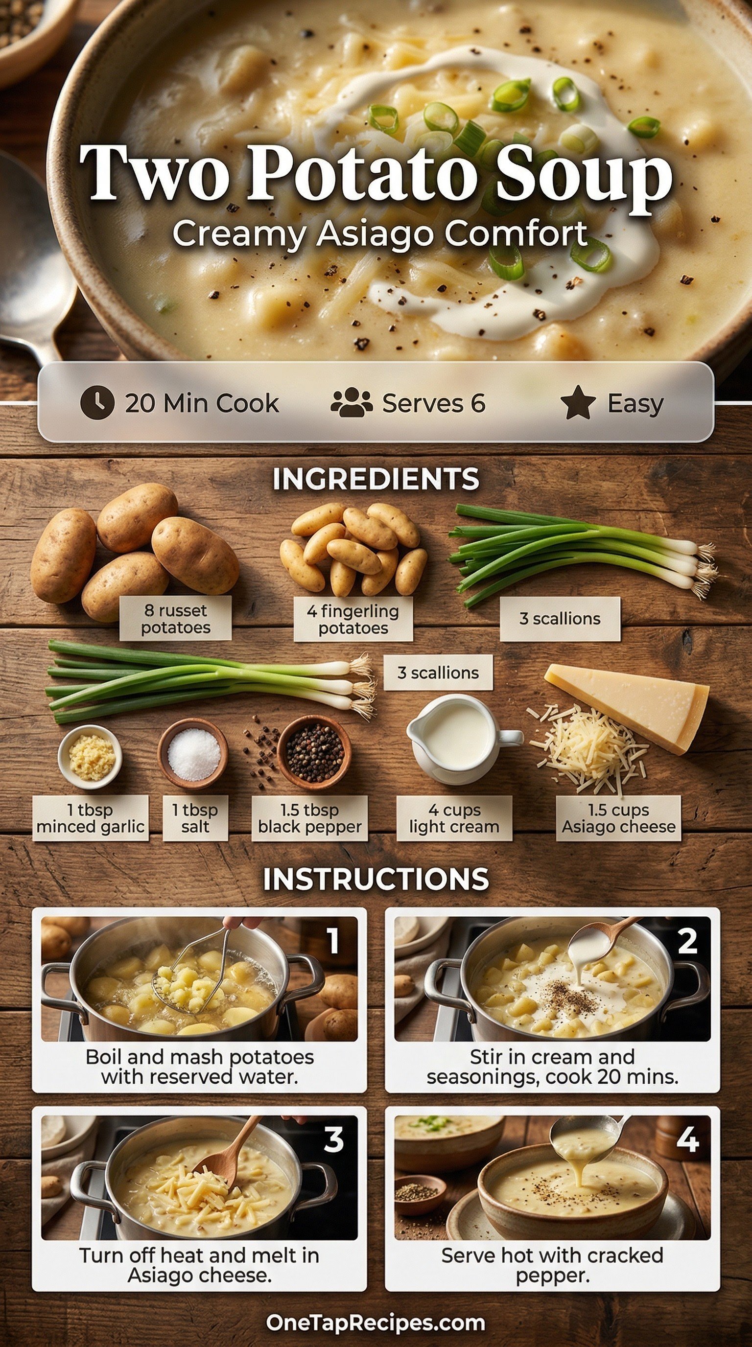 A creamy, hearty soup made with a blend of russet and fingerling potatoes. The combination of two potato varieties creates a rich, satisfying texture that forms the perfect base for melted Asiago cheese. It delivers deep comfort on a cold winter day, bringing together sharp garlic, fresh scallions, and plenty of cracked black pepper. Serve it hot when you need a quick, warming meal.