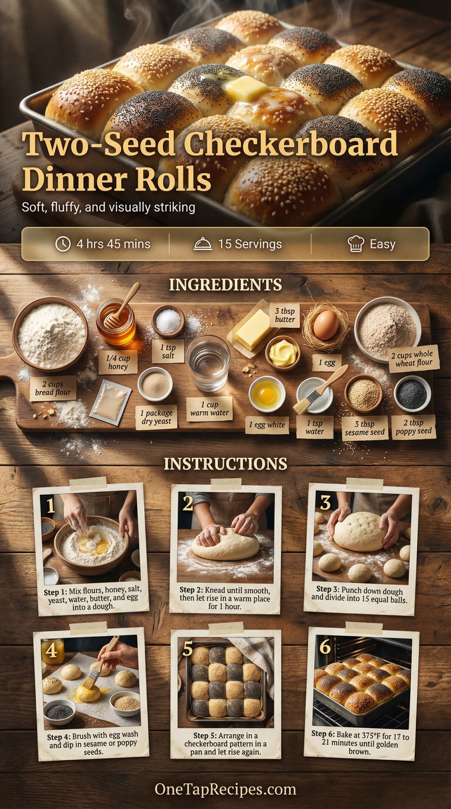 These homemade dinner rolls bring a visually striking checkerboard pattern to your table using alternating sesame and poppy seeds. A blend of bread flour and whole wheat flour gives the dough a hearty, satisfying texture, while a touch of honey adds subtle sweetness. The two-seed topping provides a delightful crunch that contrasts perfectly with the soft, fluffy interior. They are an excellent choice for holiday gatherings, weekend baking projects, or serving alongside a warm bowl of soup.