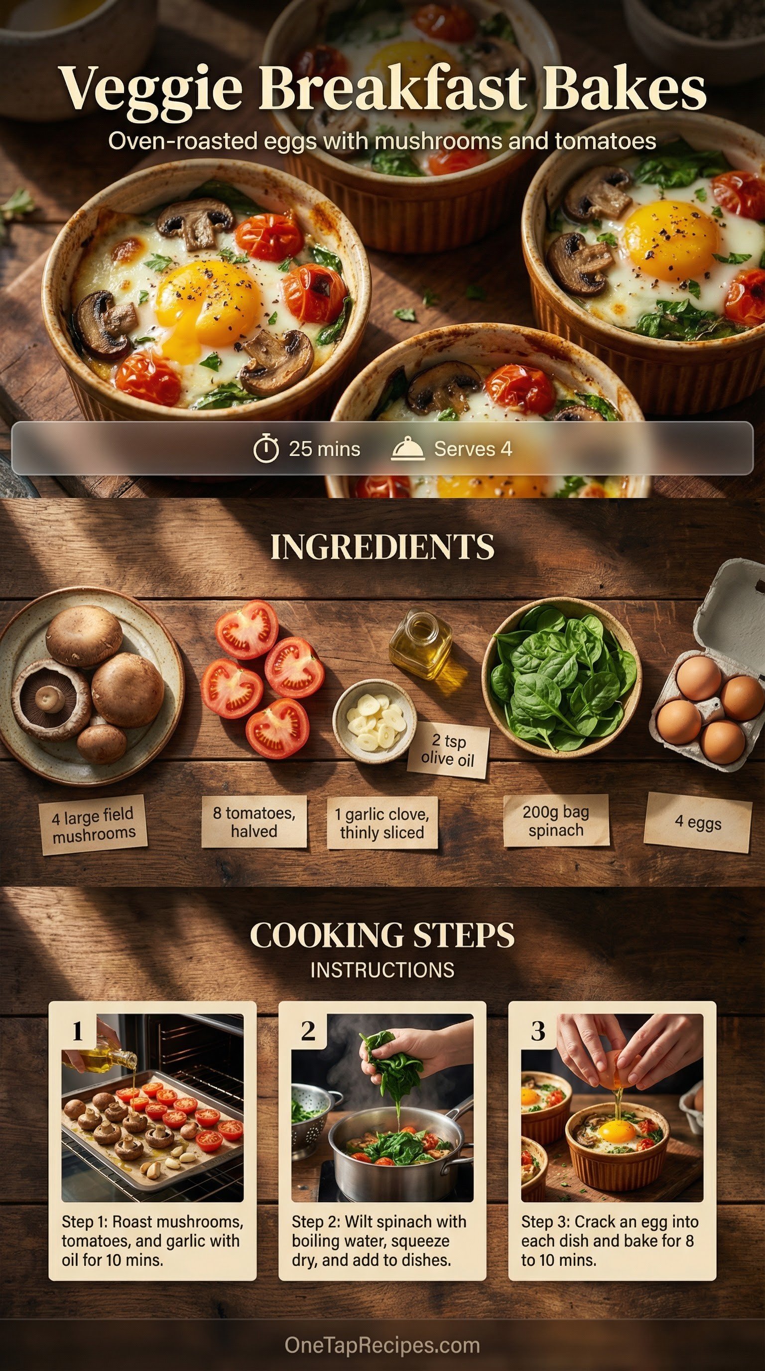 Start your morning with a warm and hearty vegetable breakfast bake. This dish swaps the traditional greasy fry-up for a lighter, oven-roasted approach. Plump tomatoes, earthy field mushrooms, and fresh spinach create a vibrant base for perfectly baked eggs. A touch of sliced garlic and olive oil brings out the natural savory flavors of the vegetables. It makes an excellent weekend brunch or a comforting start to a busy weekday. Serve it hot straight from the oven with a slice of crusty bread to soak up the rich egg yolks.
