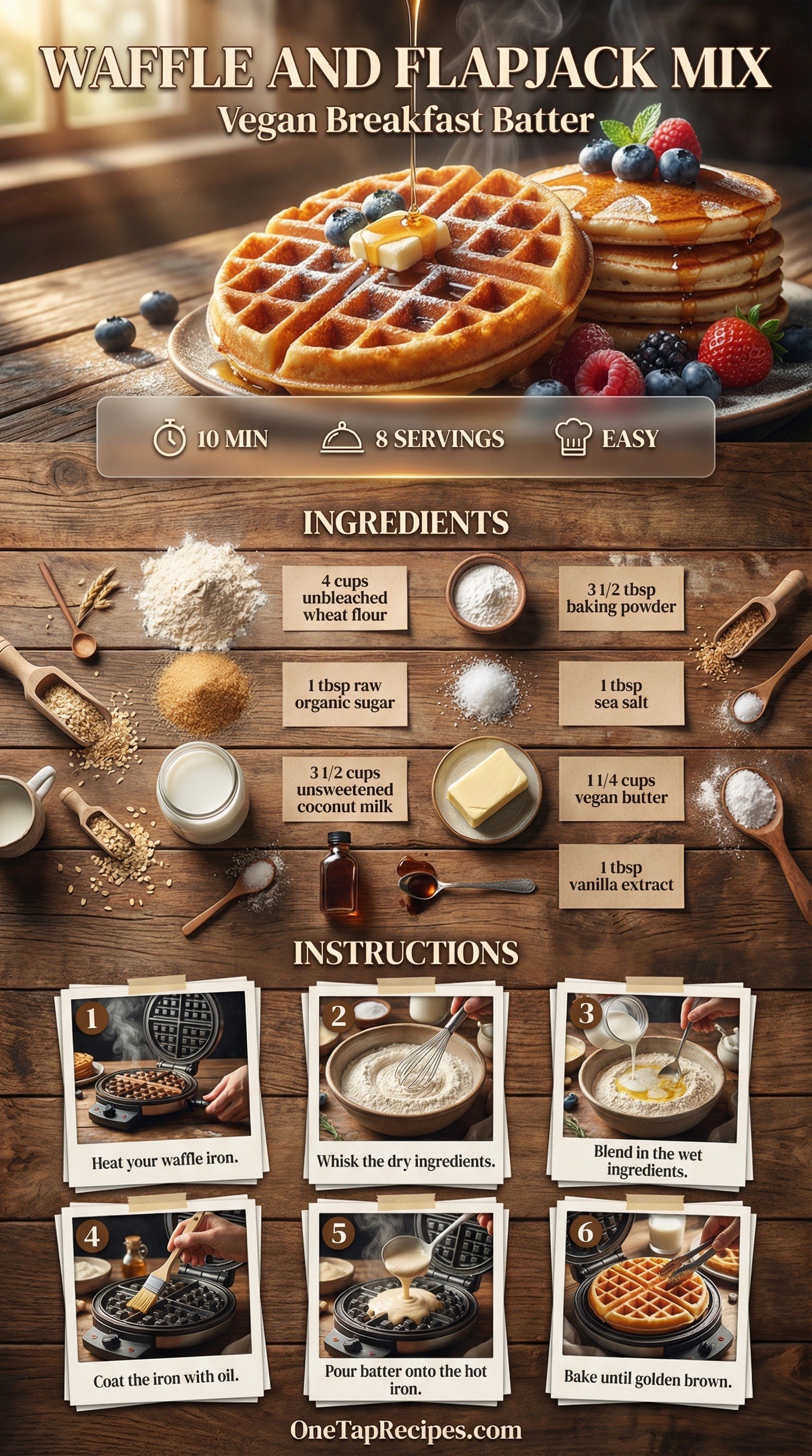 This versatile plant-based batter works perfectly for both crispy waffles and fluffy flapjacks. Unsweetened coconut milk and melted vegan butter create a rich, smooth base without any dairy. A touch of vanilla extract adds a warm, comforting aroma to your morning meal. Serve these golden brown breakfast staples during a relaxed weekend brunch or a quick weekday morning. The simple mix comes together in minutes for a satisfying start to the day.