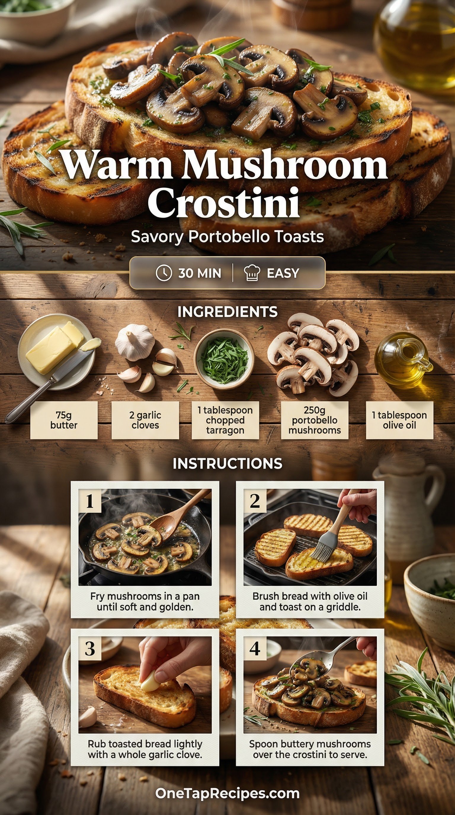 Earthy portobello mushrooms, still warm from the pan, meet crisp, garlic-rubbed toasts in this savory appetizer. You'll pan-fry the mushrooms in rich butter until they're perfectly golden and tender. Fresh tarragon brings a subtle anise note that cuts right through the richness. It's an elegant yet simple bite that sets the right tone before a dinner party or alongside a light afternoon tea.