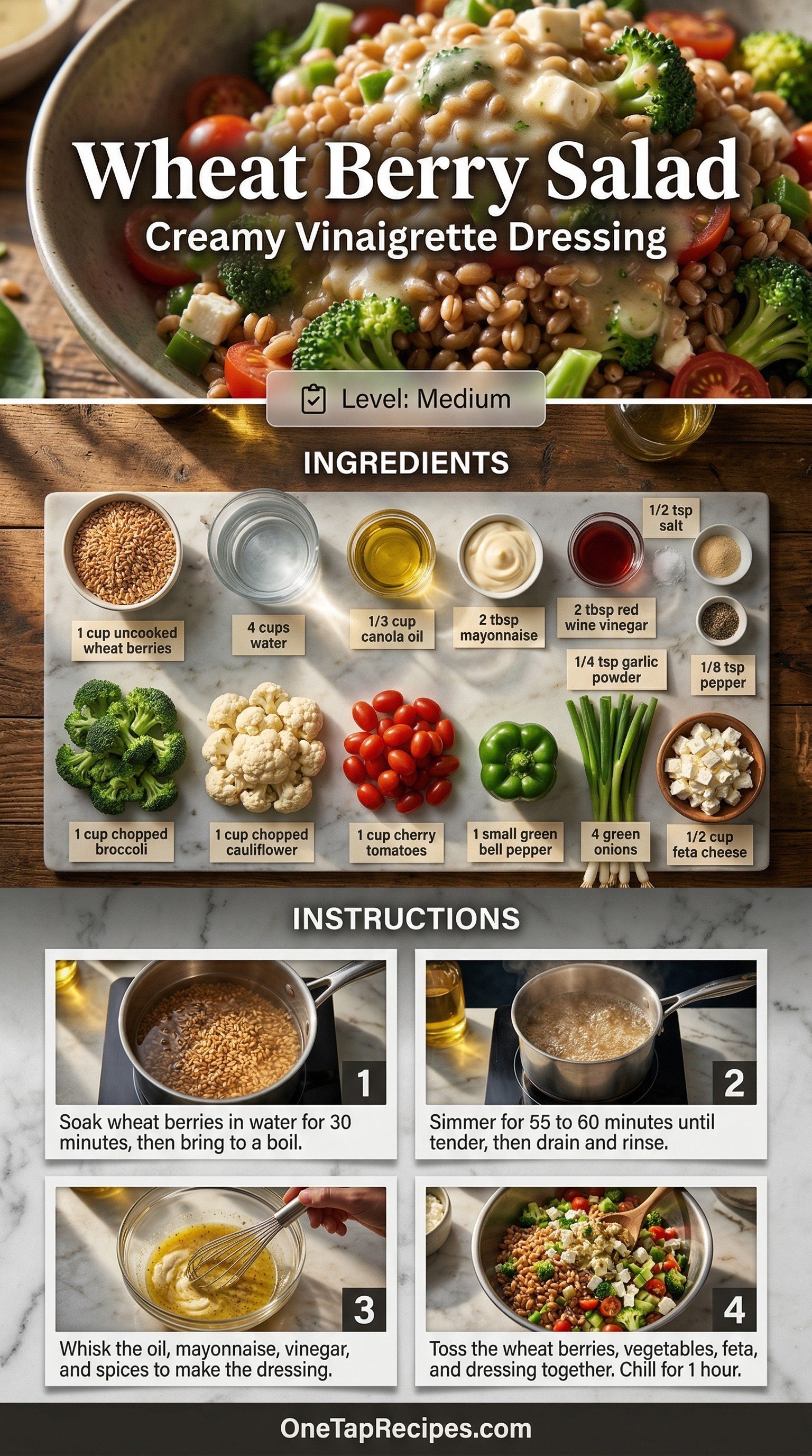This hearty wheat berry salad combines chewy whole grains with crisp raw vegetables and tangy feta cheese. A creamy red wine vinaigrette ties the fresh broccoli, cauliflower, and cherry tomatoes together for a bright, satisfying bite. It is an excellent make-ahead option for weekday lunches or a sturdy side dish for summer picnics. The grains soak up the dressing as it chills, making every spoonful deeply flavorful.