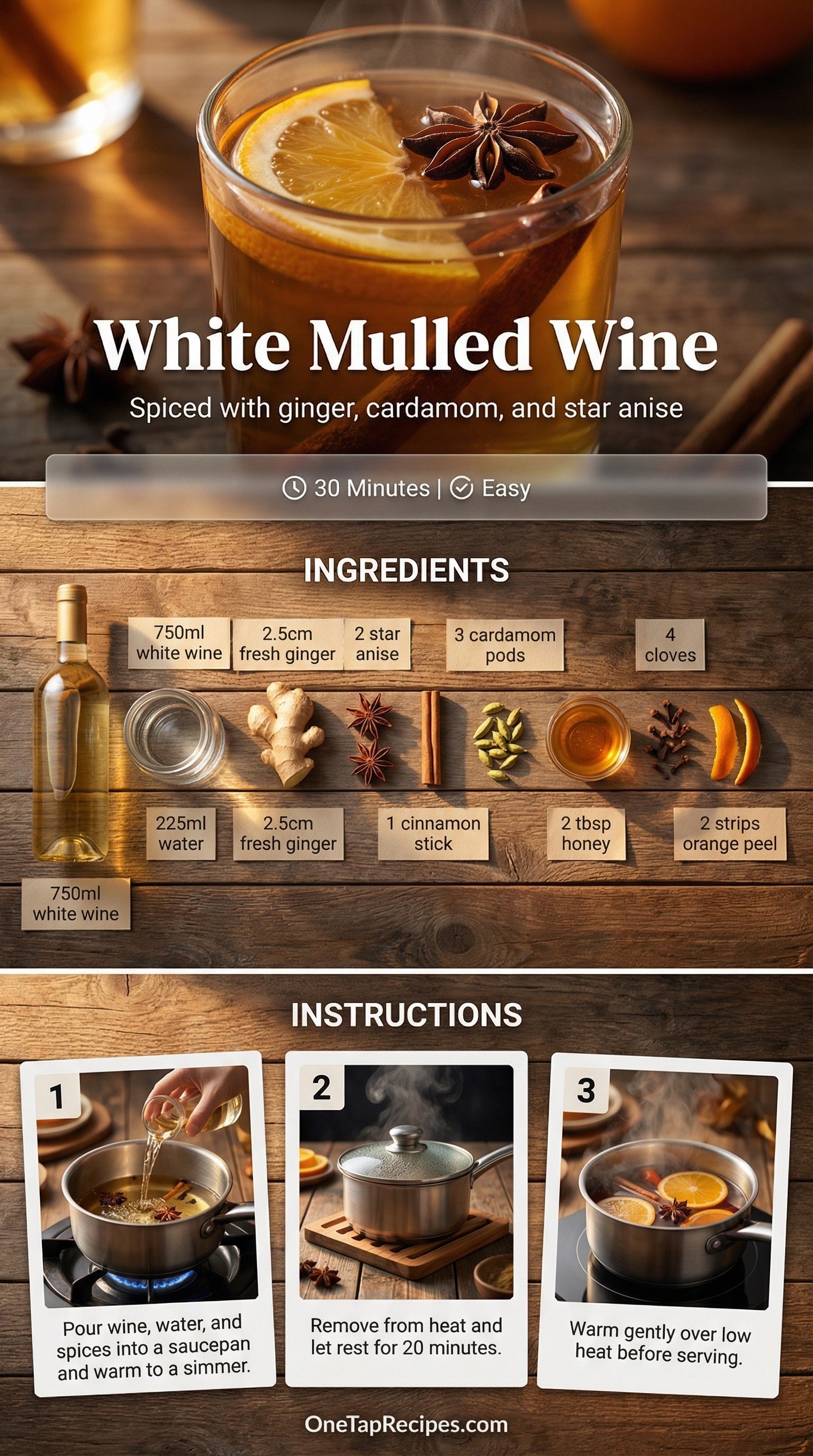 A warm, spiced white wine beverage infused with ginger, star anise, and cardamom. It offers a lighter, fresher alternative to traditional red mulled wine while still delivering deep, comforting flavors. The addition of honey and clove-studded orange peel creates a bright, aromatic profile perfect for chilly evenings or holiday gatherings. Serve it gently warmed to let the spices fully open up.