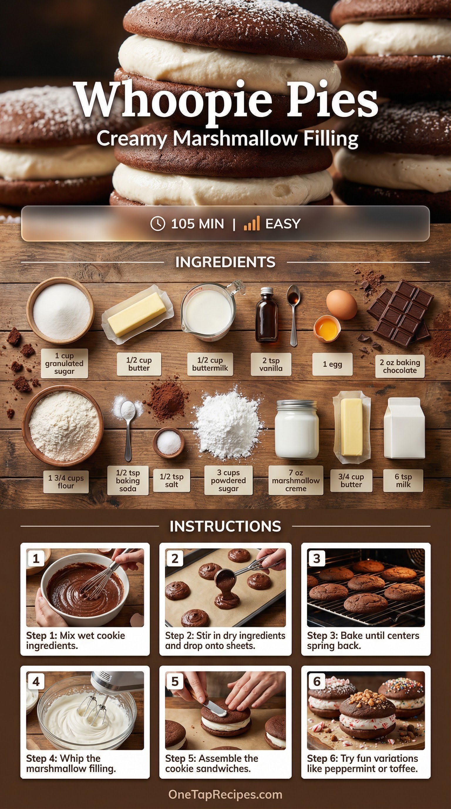 These classic chocolate whoopie pies feature soft, cake-like cookies sandwiching a sweet marshmallow center. The batter comes together quickly with melted baking chocolate and buttermilk for a rich, tender crumb. A fluffy filling made from marshmallow creme, butter, and powdered sugar holds the two halves together. They make a fun weekend baking project or a nostalgic treat for parties and bake sales.