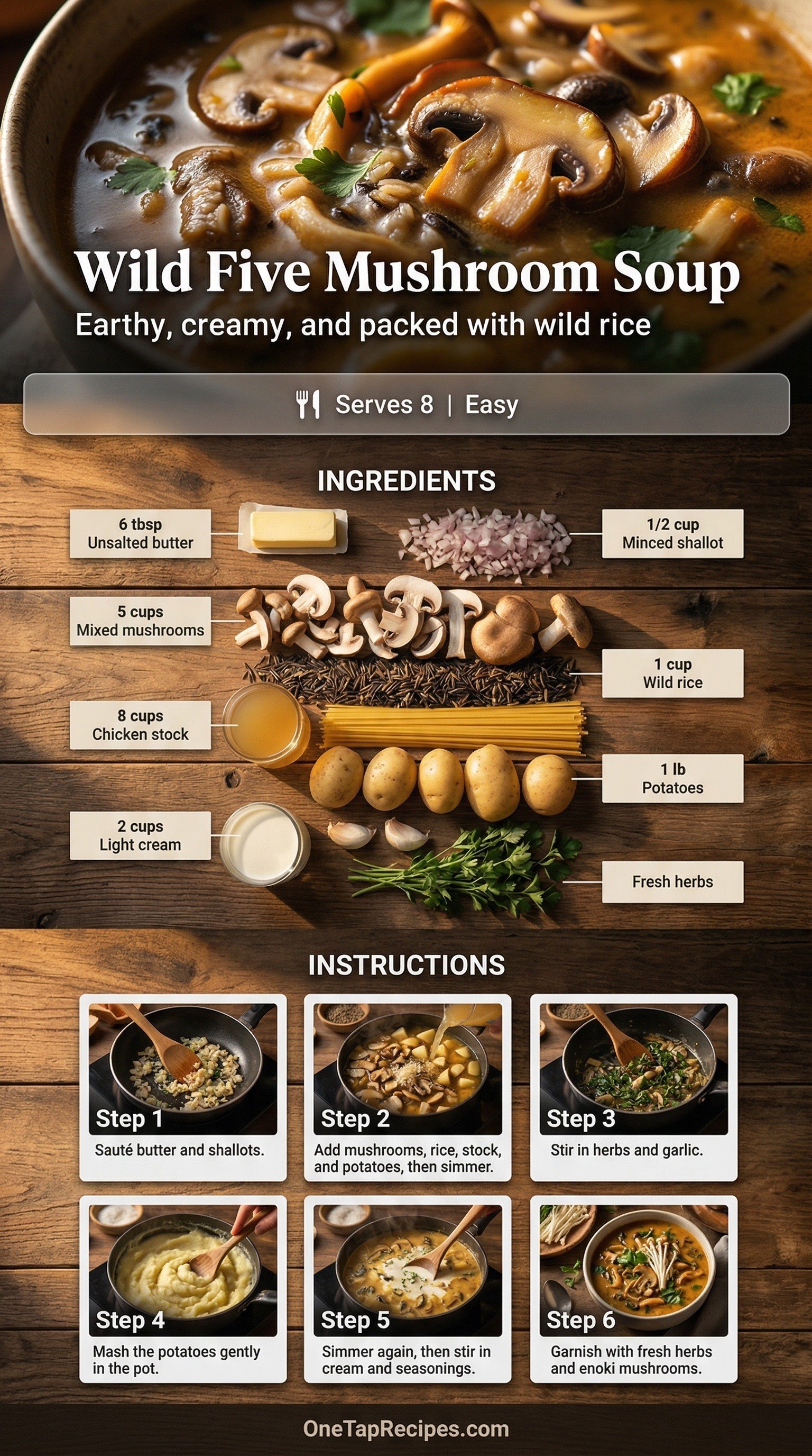 A rich and earthy mushroom soup combines five varieties of fresh mushrooms with hearty wild rice and tender potatoes. The mix of cremini, oyster, maitake, portobello, and shiitake creates a deeply savory broth with incredible texture. Light cream and butter add a luxurious finish, while fresh sage and rosemary bring bright herbal notes to every spoonful. It is a comforting bowl for chilly evenings, especially when paired with thick slices of crusty bread and sweet butter.