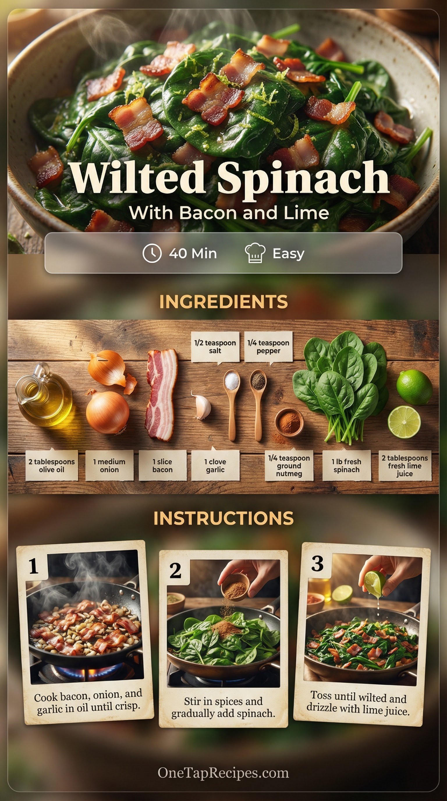 This quick stovetop side dish transforms fresh greens into a deeply savory accompaniment for any weeknight dinner. Crisp bacon, chopped onion, and garlic build a rich flavor base in the pan. A pinch of nutmeg adds subtle warmth to the greens as they gently cook down. A final drizzle of fresh lime juice cuts through the richness and brightens the entire plate.